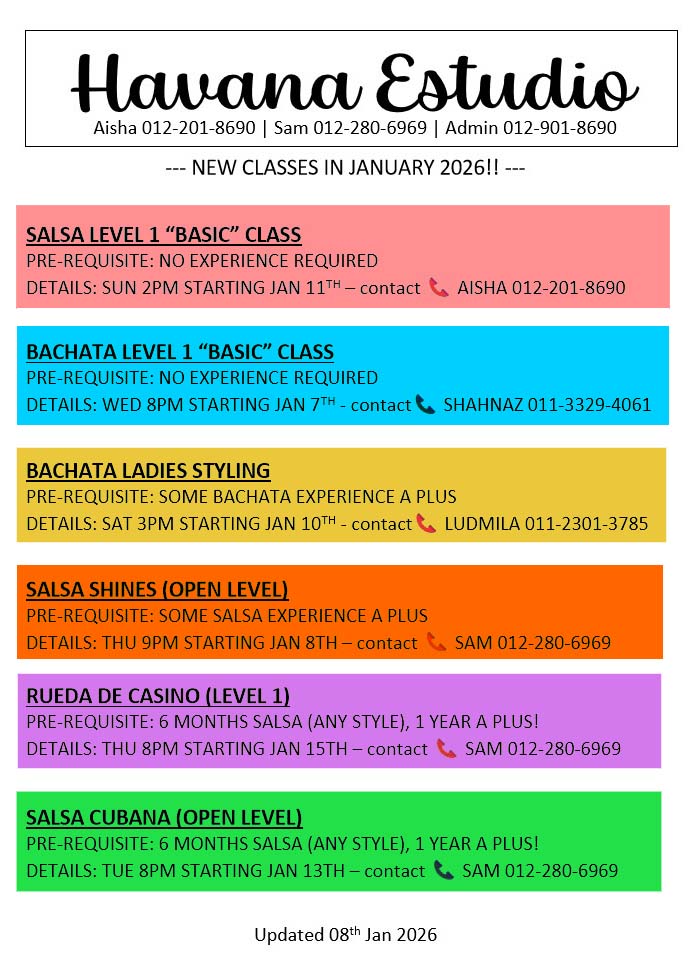 - Salsa Level 1 “Basic” – Sun 2pm – no experience necessary – new class intake starts 11th January 2026 – please contact Aisha 012-201-8690