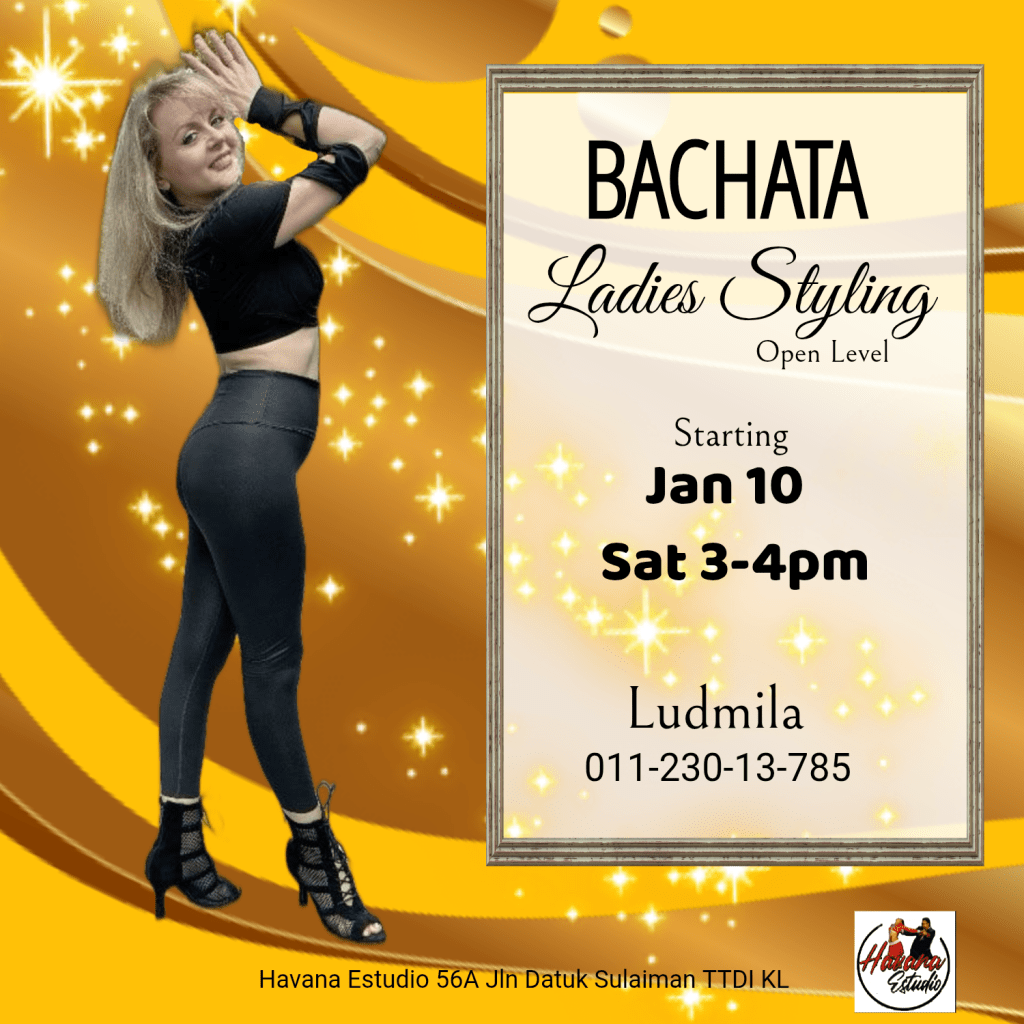 - Bachata Level 1 “Basic” – Mon 8pm – no experience necessary, no partners necessary – new class intake starts 04 Dec 2023 – contact Sam 012-280-6969