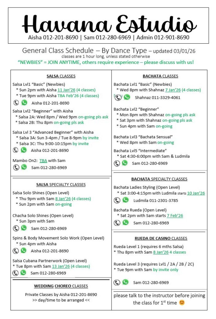 - Rueda De Casino Level 4 “Advanced Beginner 2” on Wed 9pm with Sam & Yuki – contact Sam 012-280-6969 / Yuki 016-330-0284