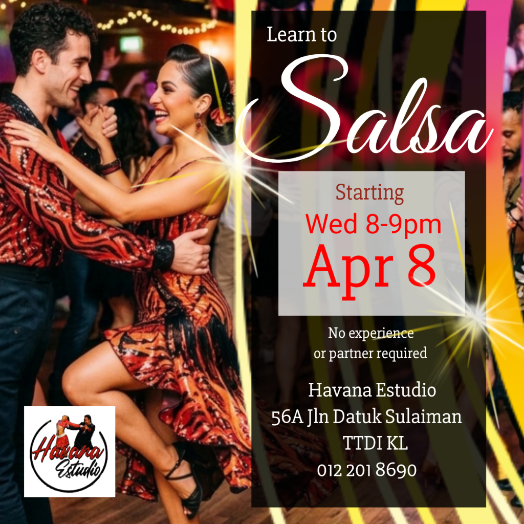 - Salsa Level 1 “Basic” – Tue 9pm – no experience necessary – new class intake starts 3rd March 2026 – please contact Aisha 012-201-8690