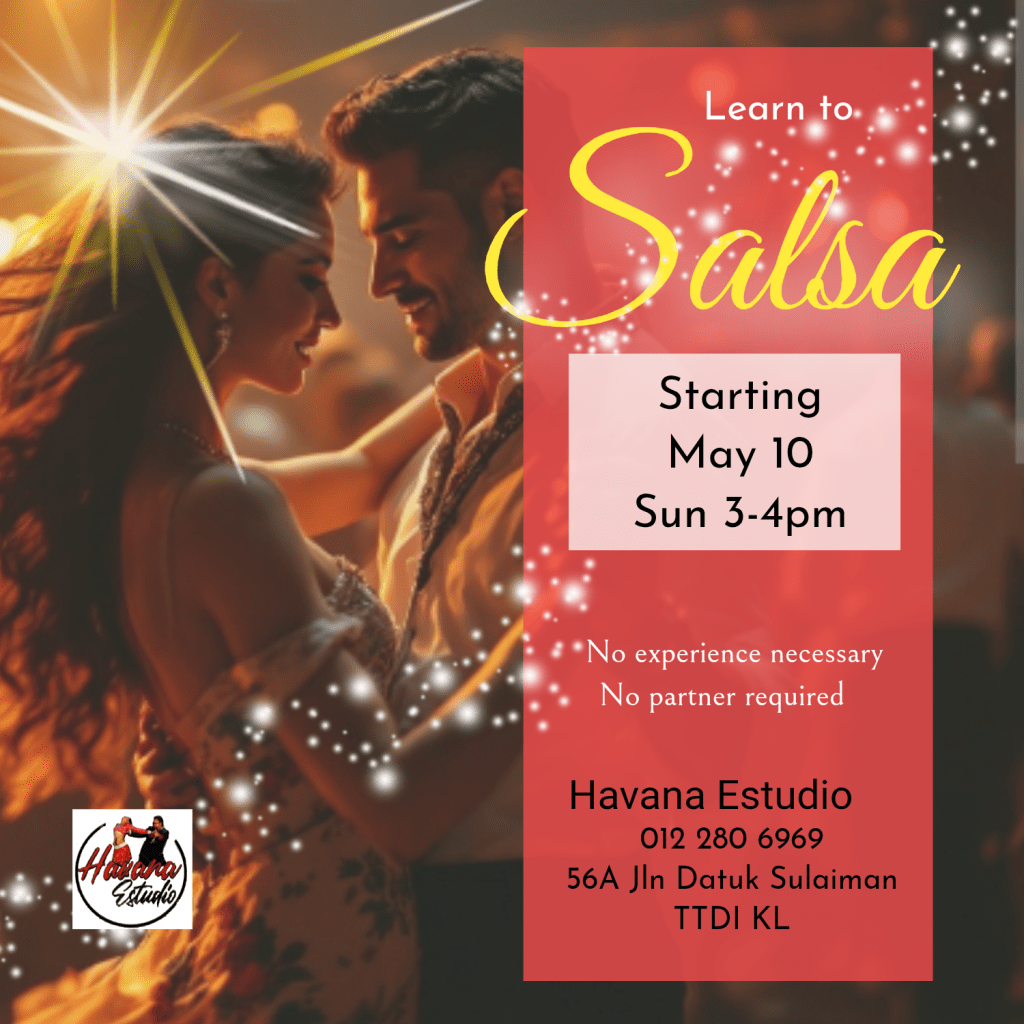 - Salsa Level 1 “Basic” – Wed 8pm – no experience necessary – new class intake starts 8th April 2026 – please contact Aisha 012-201-8690