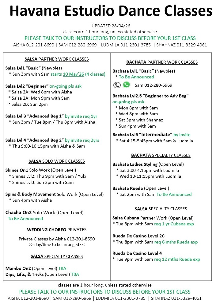 - Salsa Level 1 “Basic” – Sun 3pm – no experience necessary – new class intake starts 8th April 2026 – please contact Sam 012-280-6969 / Aisha 012-201-8690