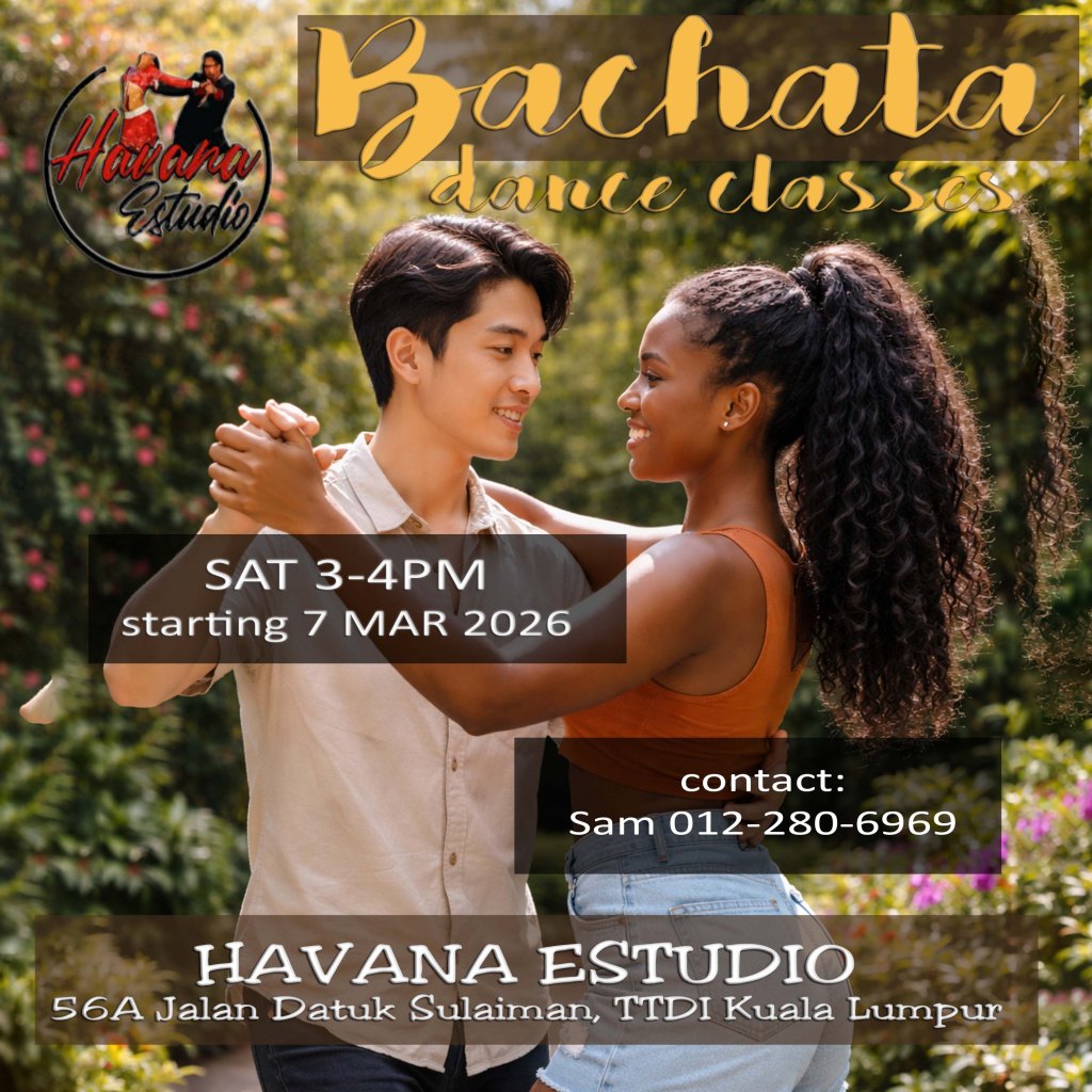 - Bachata Level 1 “Basic” – Mon 8pm – no experience necessary, no partners necessary – new class intake starts 04 Dec 2023 – contact Sam 012-280-6969